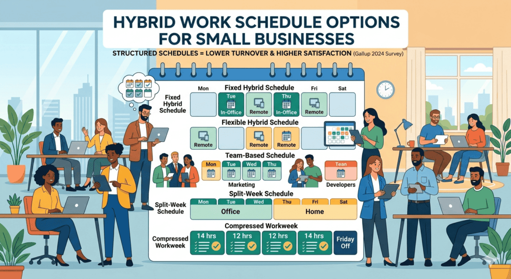 Key Insight: Small businesses that offer structured hybrid schedules see up to 22% lower turnover and report higher employee satisfaction compared to companies with no flexible policy, according to a 2024 Gallup survey.